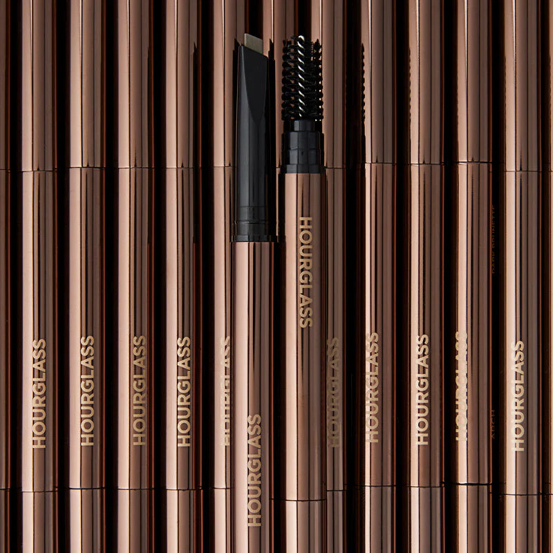 A mechanical brow pencil with a distinctive triangular-shaped tip that combines the benefits of powder, pencil and wax to effortlessly fill brows. The double-ended component also comes with a brush to blend and groom brows into place.